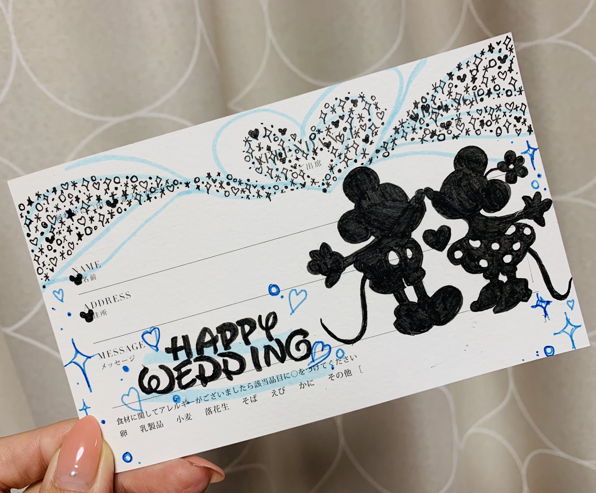 結婚式の招待状の返信ハガキには、イラストだけではなく刺繍を施すアイデアも人気です♡ ポイント返信ハガキに刺繍をすると、裏の宛名面にたくさん糸が出てしまいます。 そのため同じサイズのハガキを貼り宛先を書きなおす人が多いよう。 そこで注意したいのが郵送料。 通常のはが結婚式の招待状返信イラストディズニーよりも可愛い書き方18 ご存じですか 今結婚式の招待状の返信ハガキも簡単だけど可愛くイラストを書いたり シールでデコって返信するのが常識 仲良しの友達の結婚式 祝福の意味も込めて素敵な招待状にしたいという想いで めちゃくちゃ人気なん 結婚拝啓、ミッキーマウス様。 結婚式の招待状をミッキー・ミニーにも出すのが流行ってる marry マリー 拝啓、ミッキーマウス様。 結婚式の招待状をミッキー・ミニーにも出すのが凄い! 公開 きゅん ディズニーキャラにお手紙を出したこと
